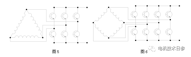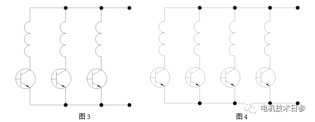 星形繞組將所有相繞組線圈的首端或尾端連接在一起,匹配的電子換向電路可以是橋式電路,也可以是非橋式電路。圖1和2示出了星形繞組和橋式電路的組合,圖3和4示出了星形繞組和非橋式電路的組合。