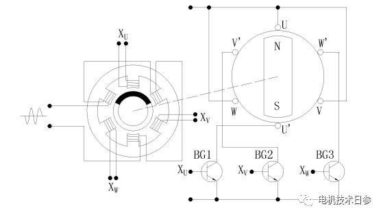 ● 當(dāng)轉(zhuǎn)子位置傳感器的轉(zhuǎn)子扇形片轉(zhuǎn)過120o電角度時(shí),扇形片使副邊輸出線圈Xv與原邊激磁線圈耦合,副邊輸出線圈XV就有輸出信號(hào),而其他兩個(gè)副邊輸出線圈XU和XW沒有與原邊激磁線圈耦合,所以沒有輸出信號(hào)。這時(shí),利用副邊輸出線圈XV的輸出信號(hào)經(jīng)整流處理后去觸發(fā)與V相電樞繞組相連接的功率開關(guān)晶體管BG2, 功率開關(guān)晶體管BG2由截止變成導(dǎo)通,而功率開關(guān)晶體管BG1由導(dǎo)通變成截止,電源給V相電樞繞組供電。