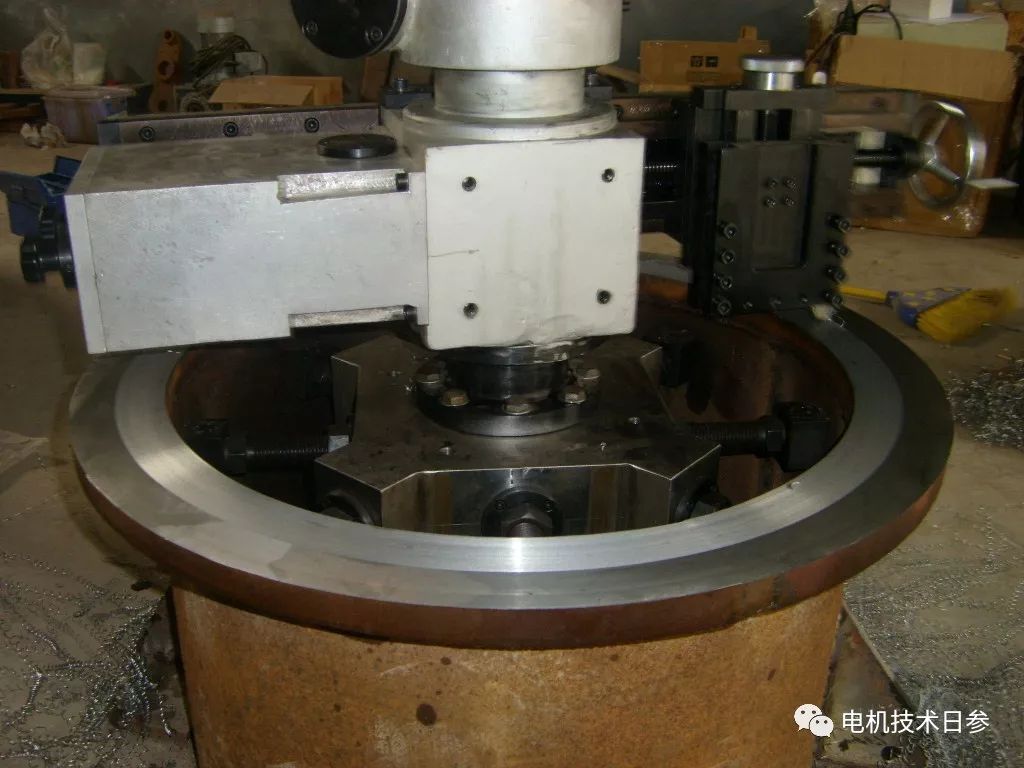 現(xiàn)場(chǎng)跟蹤技術(shù)人員小L講,為解決電機(jī)斷電停轉(zhuǎn)時(shí)間不一致問題,他自己現(xiàn)場(chǎng)逐臺(tái)手盤電機(jī),試圖憑手感知玄機(jī)。經(jīng)整整一上午,初步判定可能與機(jī)座加工有關(guān)。抽出轉(zhuǎn)子后,將定子在立式車床上固定牢靠檢測(cè)機(jī)座止口跳動(dòng)。果然如此,水平、垂直兩方向不一致,應(yīng)該是應(yīng)力釋放后引起的變形。