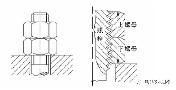 ●防松措施。防止螺紋松動(dòng)的根本在于防止螺紋副的相對(duì)運(yùn)動(dòng),主要和常用的方法有:(1)利用相對(duì)磨擦作用,具體的措施包括對(duì)緊螺母、彈簧墊圈、金屬鎖緊螺母、尼龍圈鎖緊螺母、楔緊螺紋鎖緊螺母等。